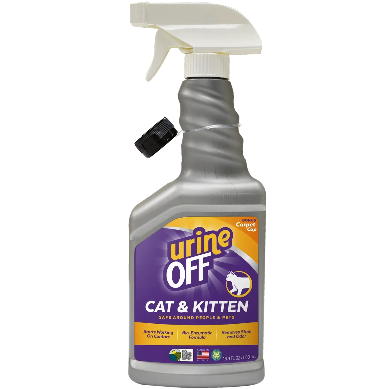 TropiClean Urine Off – це спрей високої ефективності для видалення органічних плям і запахів від сечі котів і кошенят. Нова покращена формула має більш високу в’язкість, яка краще прилипає до вертикальних поверхонь, які обмочили кішки: меблі або оббивку. Засіб діє безпосередньо на білок, через який сеча має різкий запах і швидко його усуває. Саме усуває, а не маскує! Головна перевага це чудова дія спрею як на свіжі, так і на старі плями та запах від сечі. Крім того, усунувши плями і запах, засіб допоможе відучити вашого улюбленця мітити в тому самому місці і зберегти предмети інтер’єру.